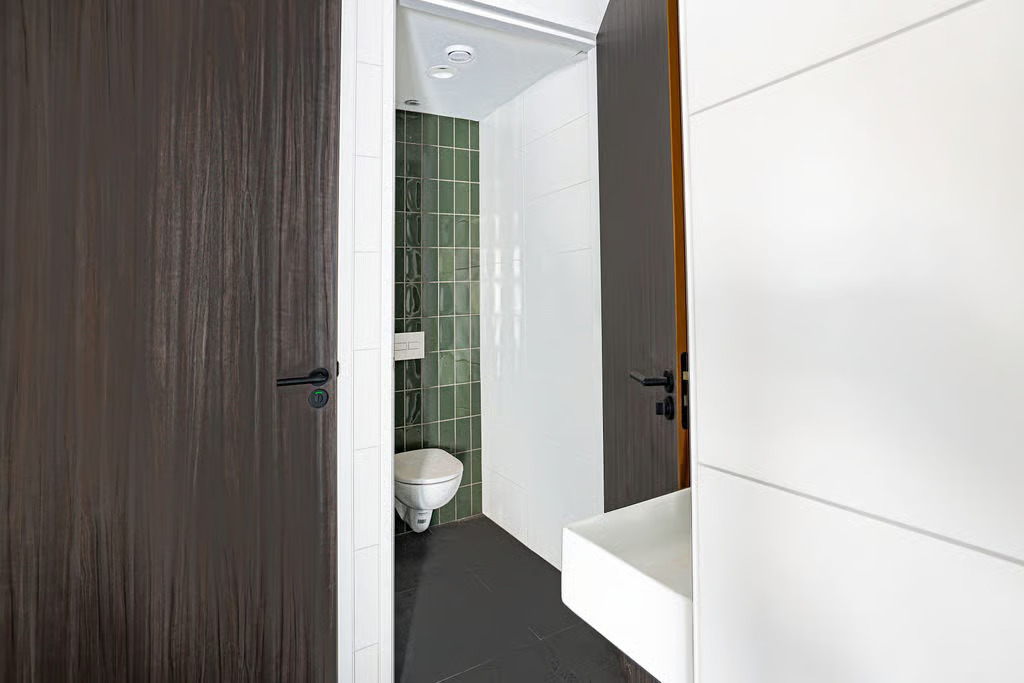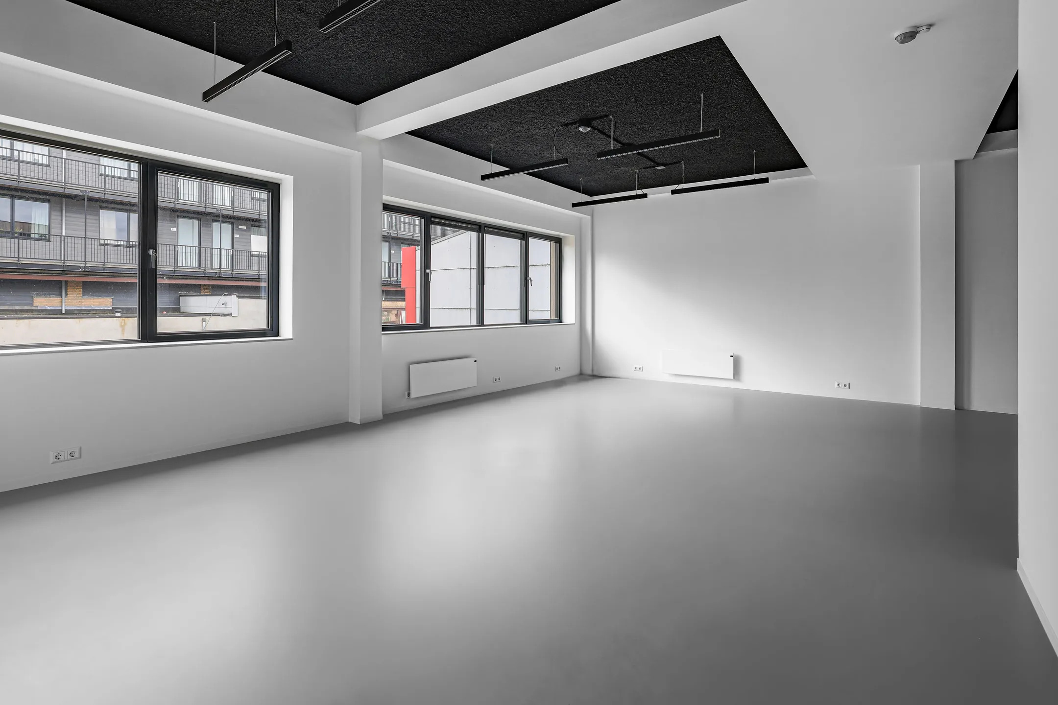 - Een industrieel plafond (akoestisch afgewerkt) inclusief vrij hangende LED verlichtingsarmaturen;