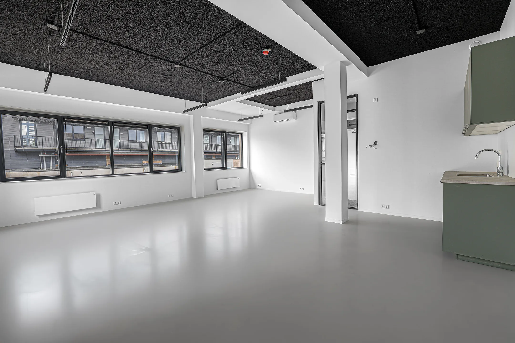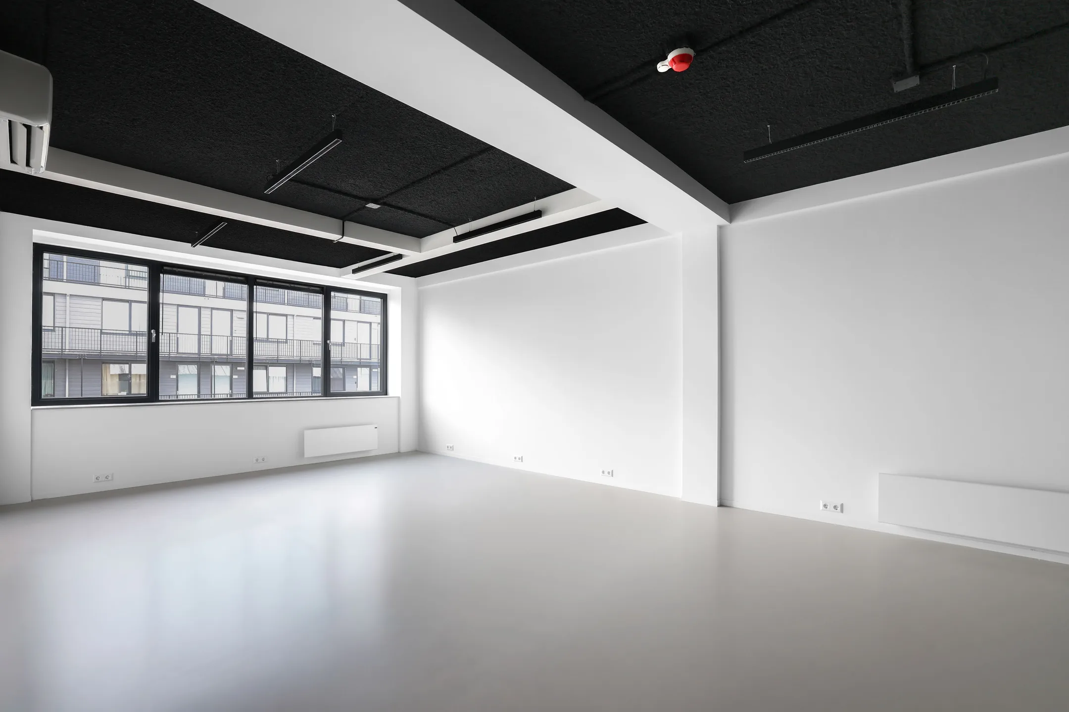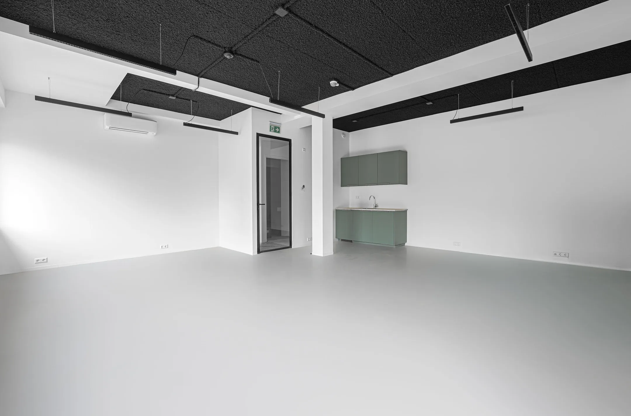 - Een industrieel plafond (akoestisch afgewerkt) inclusief vrij hangende LED verlichtingsarmaturen;
