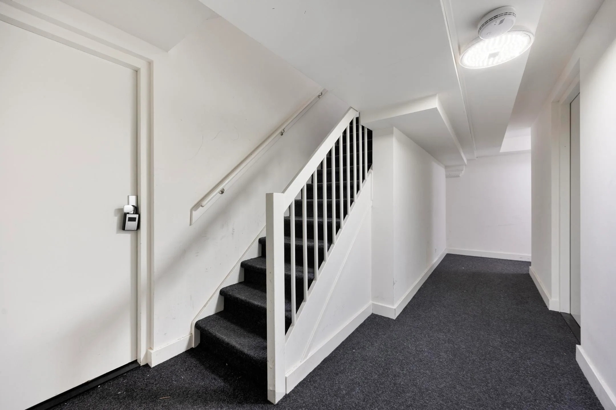 Afgesloten entree met bellentableau, postkasten.