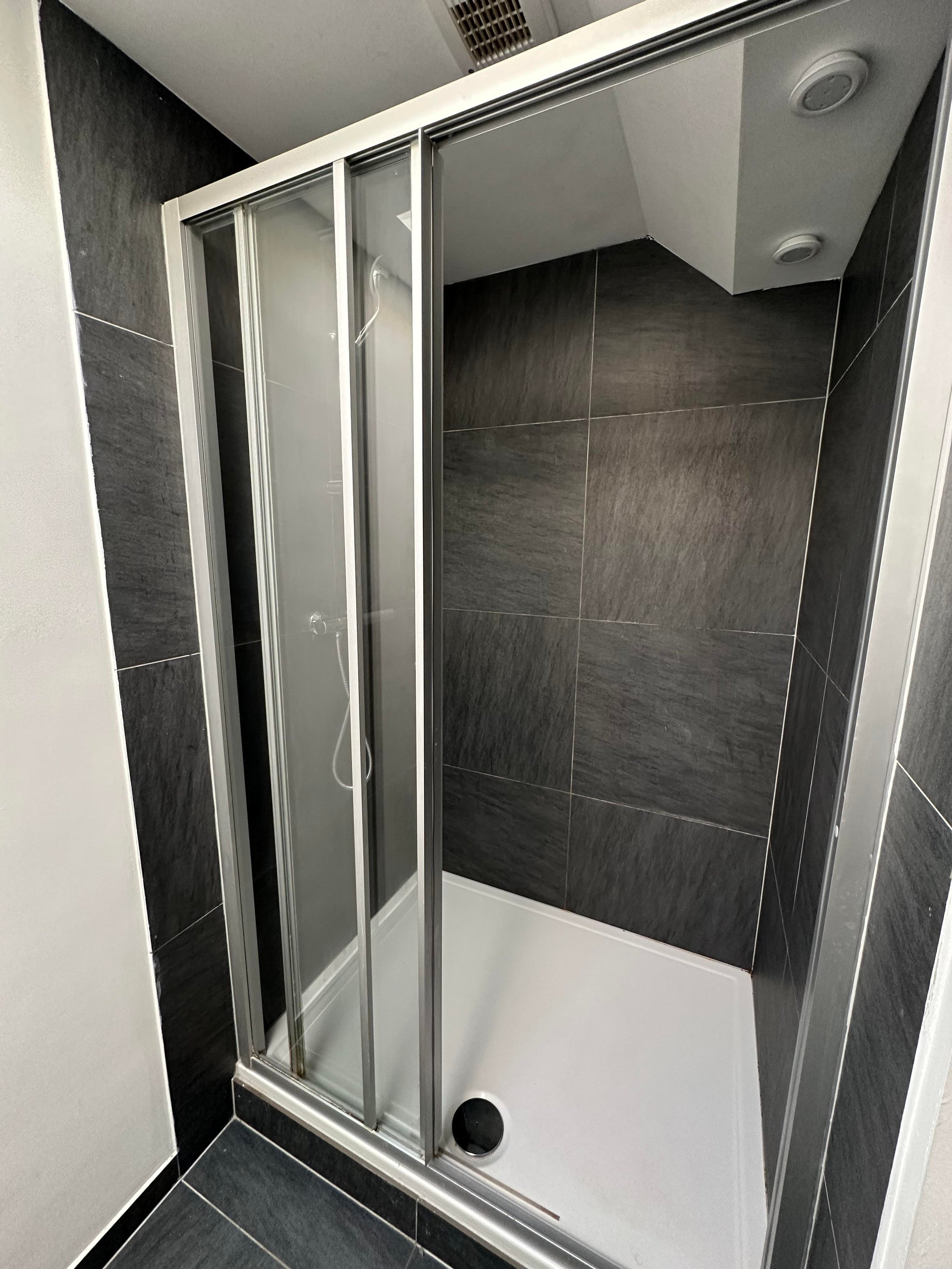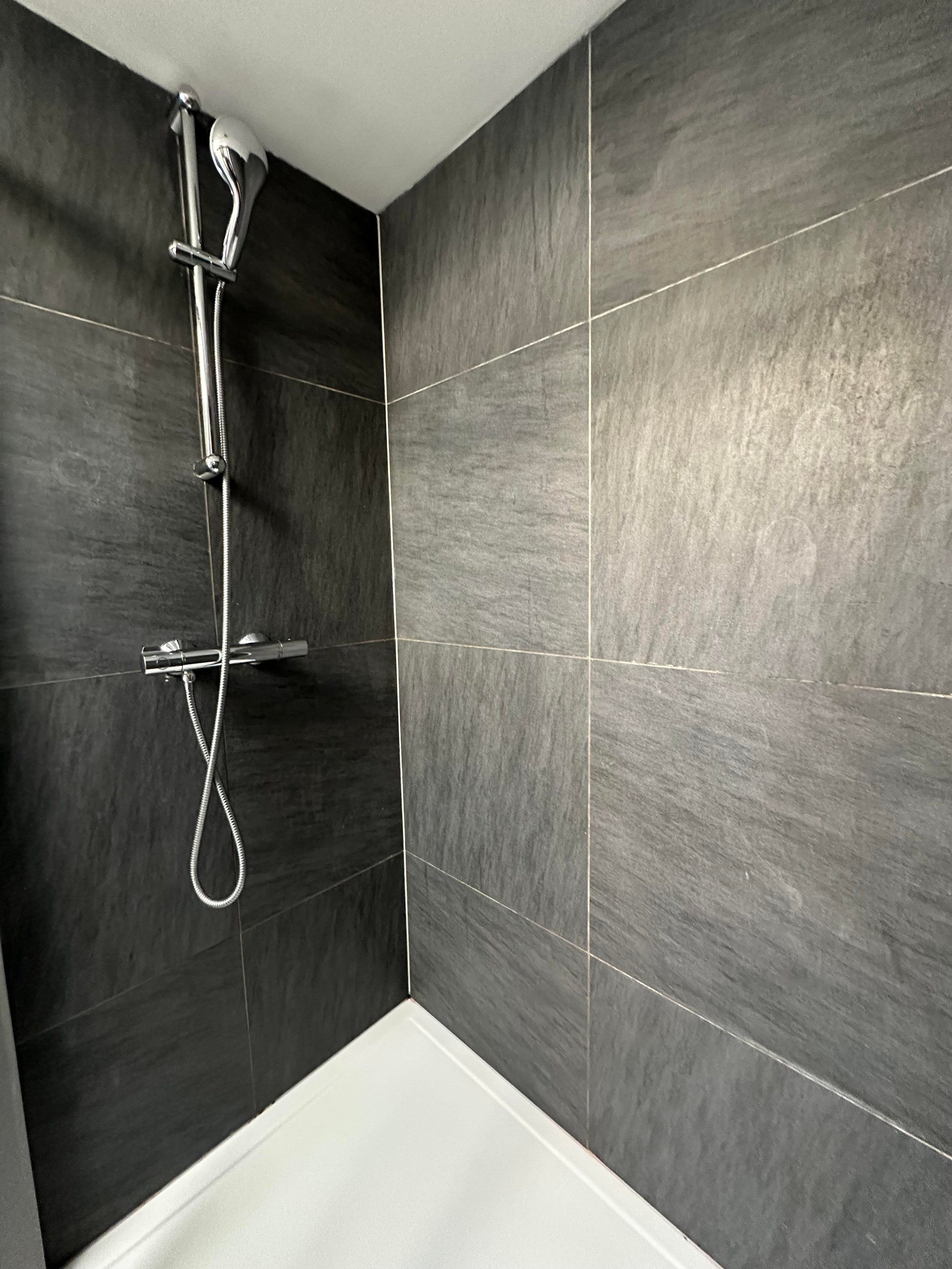 De badkamer is netjes afgewerkt en voorzien van een douche en wastafel met bijbehorend wastafelmeubel.